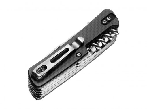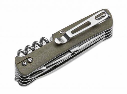 El cuchillo de tres piezas Böker tiene una cuchilla, un abrebotellas y, por supuesto, un sacacorchos.