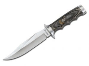 Elegante cuchillo de combate con una hoja Bowie de 15,3 cm de longitud fabricada en acero inoxidable 440. El mango de madera contrachapada de granulosidad se apoya de forma segura en la mano gracias a las ranuras de los dedos. Herrajes de acero inoxidable con acabado satinado. Funda de cuero con bolsillo delantero y piedra de afilar.