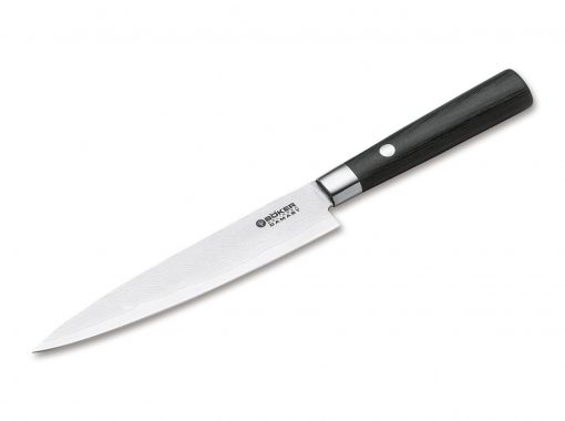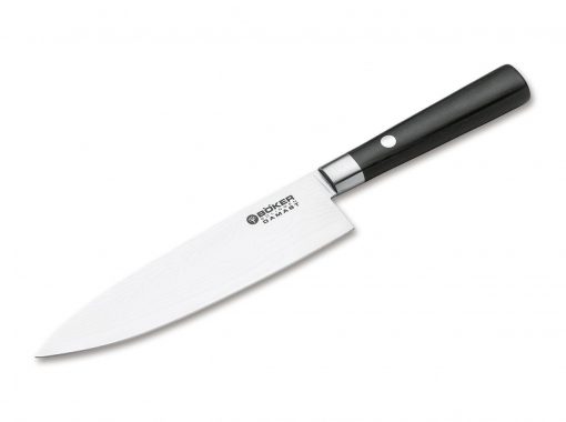La serie de cuchillos del chef Boker Damask Black combina tradicionalmente formas de mango japonesas hechas de contrachapado negro con cuchillas afiladas hechas de damasco inoxidable con 37 capas de acero, que se caracterizan por un grano hermoso.