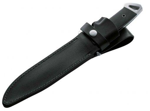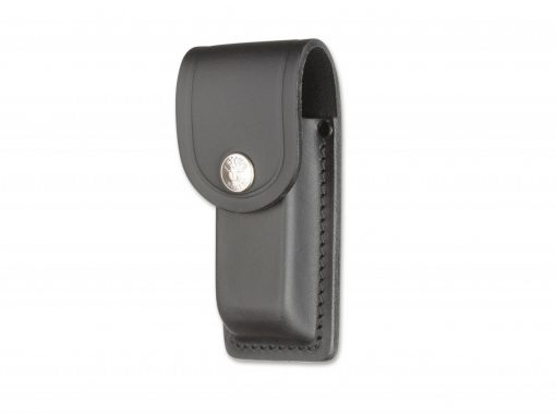 La funda de cuero con tapa abierta y la botella con botón permite un acceso más fácil al cuchillo que las fundas clásicas con solapa completa en la tapa. El cuero de la silla de montar de alta calidad y la mano de obra impecable distinguen los casos de Fox.