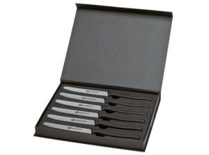 Seis cuchillos de pan versátiles con cuchillas de acero inoxidable de alta calidad con borde afilado serrado para un corte superior. Los mangos de plástico negro son seguros en la mano. Entrega en una caja de regalo decorativa.