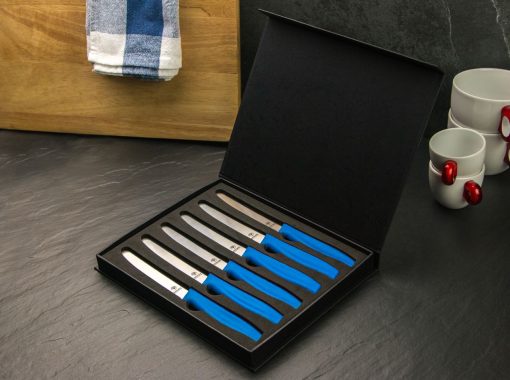 Seis cuchillos de pan versátiles con cuchillas de acero inoxidable de alta calidad con borde afilado serrado para un corte superior. Los mangos de plástico azul están seguros en la mano. Entrega en una caja de regalo decorativa.