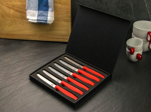Seis cuchillos de pan versátiles con cuchillas de acero inoxidable de alta calidad con borde afilado serrado para un corte superior. Los mangos de plástico rojo están seguros en la mano. Entrega en una caja de regalo decorativa.