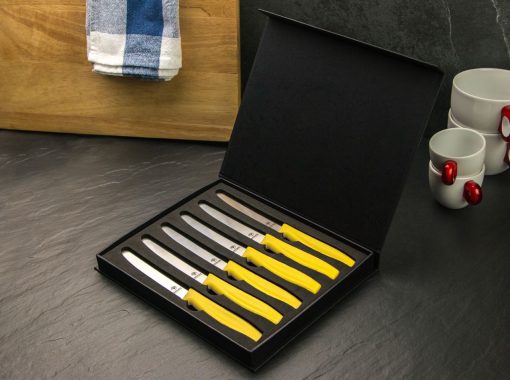 Seis cuchillos de pan versátiles con cuchillas de acero inoxidable de alta calidad con borde afilado serrado para un corte superior. Los mangos de plástico amarillo son seguros en la mano. Entrega en una caja de regalo decorativa.