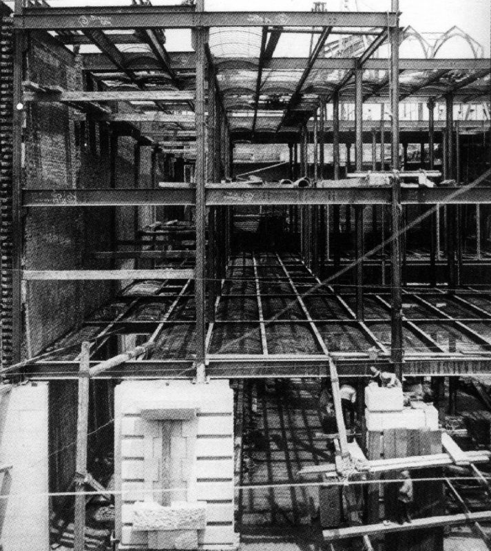 Antes del incendio del año 1975, esta estructura soportaba el vidrio rayado translúcido que tenía una malla de alambre integrado. El vidrio fue sustituido por un sándwich de láminas metálicas y poliuretano. Solamente los ventanales laterales sirven hoy de tragaluz.