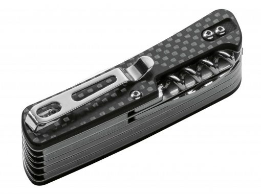 Equipado con una hoja grande (12C27) y las siguientes herramientas (4Cr13): interruptor de cristal, destornillador grande con abrebotellas y doblador de alambre / -abisolierer, punta de destornillador de hoja de sierra pequeña, la fianza veces, sacacorchos, tijeras, costura / llave de golpe, alicates, sierra para madera, clip. Manejar espesor 27mm.