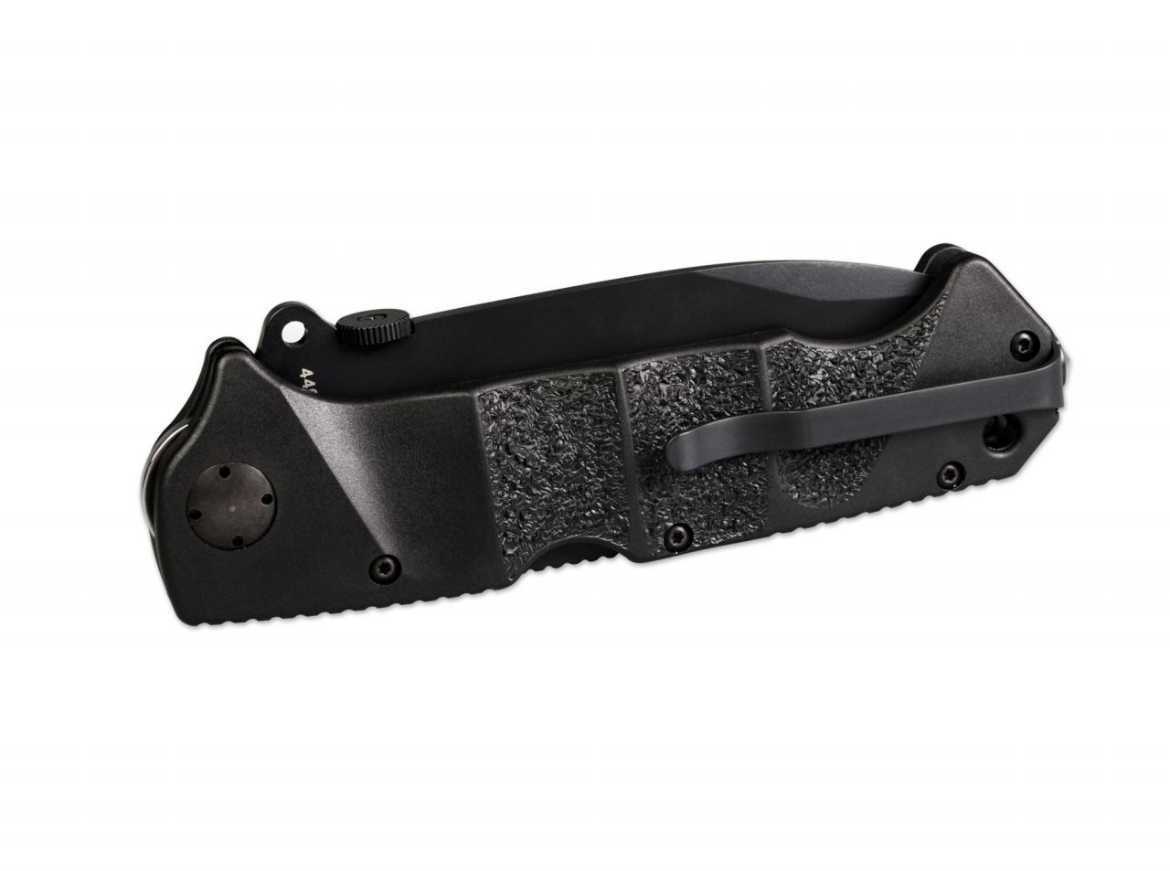 El diseño de la hoja recurva hace que el RBB de Jim Wanger sea aún más interesante para las tareas diarias. La hoja plana y cónica 440C facilita enormemente el reafilado. Para la protección contra la corrosión y la reflexión, la cuchilla está recubierta de negro, además está equipada con un borde dentado.