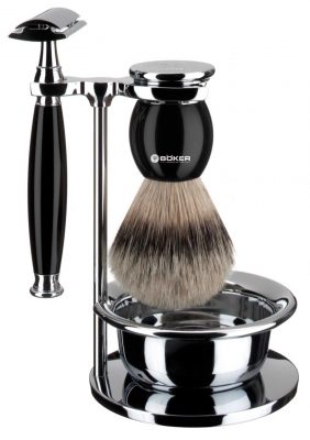Set de afeitado de tres partes de alta calidad con asas hechas de resina preciosa y acentos de metal cromado. El soporte está hecho de metal, tiene un cromado duro y, por lo tanto, está perfectamente procesado para accesorios de afeitado en húmedo.