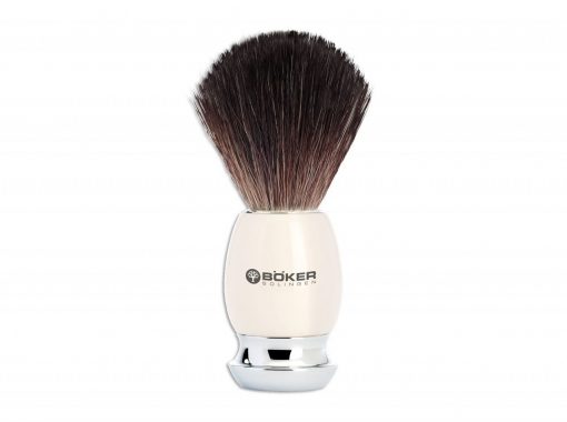 Esta brocha de afeitar hecha de resina preciosa blanca está equipada con fibra vegana de calidad negra. Algunos usuarios prefieren este material en comparación con el pelo de tejón real, ya que se puede usar de forma muy simple y con una crema de afeitar muy cremosa.