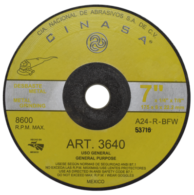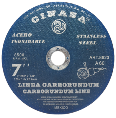 Disco de Corte Delgado para Acero Inoxidable. Dimensiones: 7" (177mm) x 1/16" (1.6 mm) x 7/8" (22.2 mm). R.P.M.: 8,600. Graduación: A60.