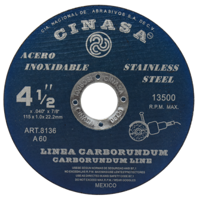 Para operaciones de cortes de acero inoxidable, tubo, ángulo, perfil y solera. Dimensiones: 14" (350 mm) x 7/64" (2.8 mm) x 1" (25.4 mm). R.P.M.: 4,365. Graduación: A24.