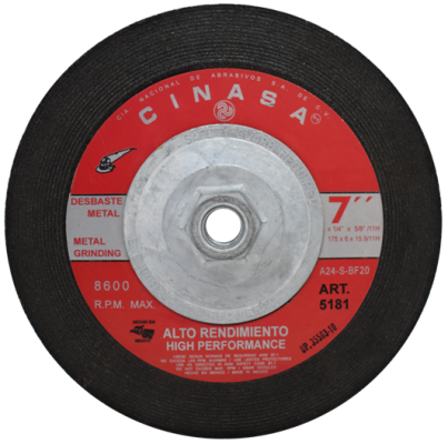 Disco de Corte Delgado para Acero Inoxidable. Dimensiones: 7" (177mm) x 1/16" (1.6 mm) x 7/8" (22.2 mm). R.P.M.: 8,600. Graduación: A60.